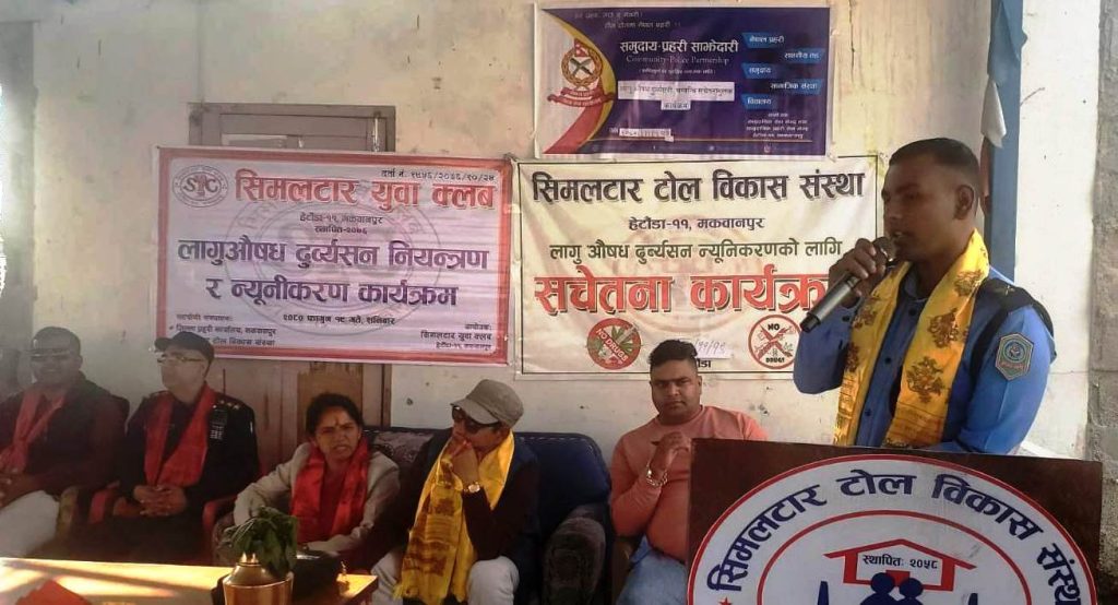 कार्यक्रममा बोल्दै जिल्ला प्रहरी कार्यालय मकवानपुरका प्रहरी निरिक्षक ओमप्रकाश पण्डितले १३ वर्षदेखि १९ वर्ष उमेरका युवाहरु लगुऔषधको कुलतमा फसेको बताए । युवाहरुलाई सुधार गर्न समुदाय र प्रहरीले मिलेर काम गर्न सकेमा मात्र सम्भव हुने बताए । प्रहरी निरिक्षक पण्डितले अभिभावकको माया नपाएर, साथीभाईको सिकोबाट, बढी भावनात्मक भएर, देखासिखी गर्दा, राम्रो शिक्षा नपाएर र धार्मिक अतिवाद जस्ता कारणहरुले युवाहरु क्ुलतमा फस्ने बताए ।