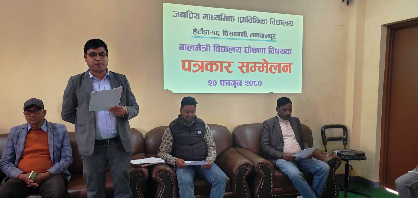 यही फागुन २२ गते मंगलबारका दिन विद्यालय बालमैत्री घोषणा हुने कार्यक्रम रहेको पत्रकार सम्मेलन गर्दै विद्यालयका प्रधानाध्यापक जिधराज ढकालले जानकारी दिए । विद्यालयकी बालसहभागी (छात्रा) सुप्रिया मुक्तानको अध्यक्षतामा भएको पत्रकार सम्मेलनमा हेटौँडा ८ का वडाअध्यक्ष राम थापाको विशेष आतिथ्यता रहेको थियो । विद्यालयले बालमैत्री हुन पूर्वरुपमा सूचक पालन गरेकोले बालमैत्री घोषणालाई समस्या नभएको हेटौँडा ८ की वडा सहजकर्ता रोजिता दंगालले बताईन् ।