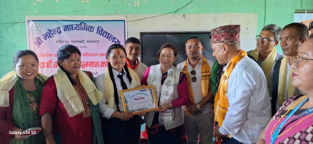 वि.सं. २०८० को एसईई तथा १० जोड २ परिक्षामा उत्कृष्ट अंकसहित उतिर्ण भएका विद्यार्थीहरुलाई स्वागत तथा बिदाई कार्यक्रम गरिएको हो । बुधबार विद्यालय परिसरमा आयोजित कार्यक्रममा हेटौंडा उपमहानगरपालिकाकी नगर प्रमुख मीनाकुमारी लामाले विद्यार्थीहरुलाई सम्मान गरेकी थिईन् ।