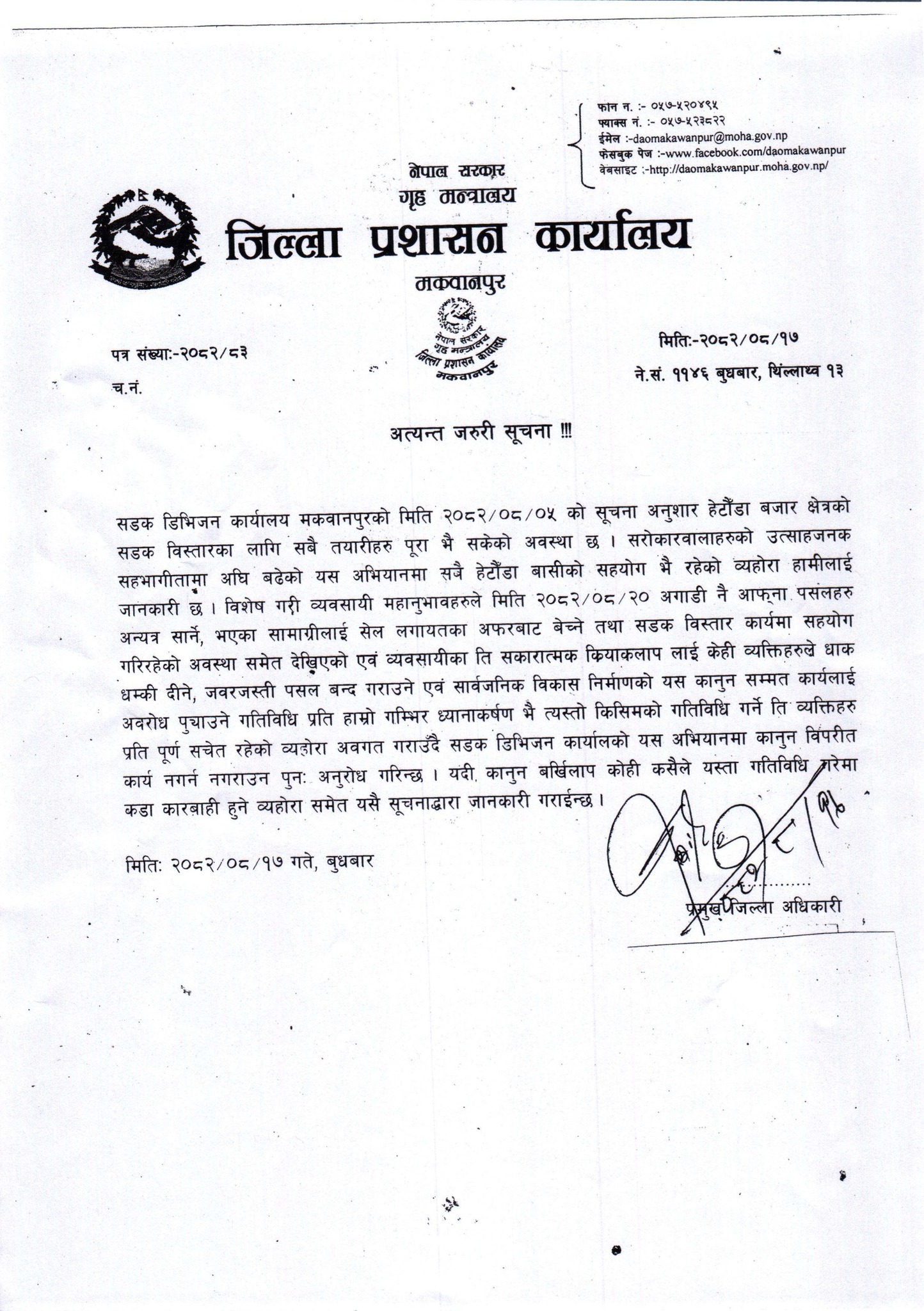 प्रशासनले सूचनामा भनेको छ, “सडक डिभिजन कार्यालयको यस अभियानमा कानुन विपरीत कार्य नगर्न नगराउन पुनः अनुरोध गरिन्छ। यदी कसैले यस्ता गतिविधि गरे कडा कारबाही गरिनेछ।”