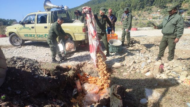 मकवानपुर, १ मंसिर । हेटौँडा उपमहानगरपालिकाको नगर प्रहरीले जफत गरेको मिठाई तथा तरकारी नष्ट गरेको छ । फुटपाथमा बिक्रीका लागि राखेको सामग्री नगर प्रहरीले जफत गरी नष्ट गरेको हो ।